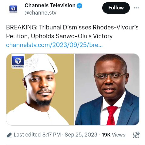 Just like it did with the Peoples Democratic Party (PDP), the Lagos State Governorship Election Tribunal has dismissed the petition of the Labour Party (LP) candidate Gbadebo Rhodes-Vivour.