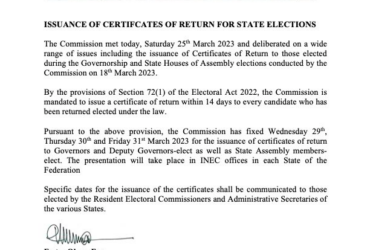 The Commission met today, Saturday 25th March 2023 and deliberated on a wide range of issues including the issuance of Certificates of Return to those…